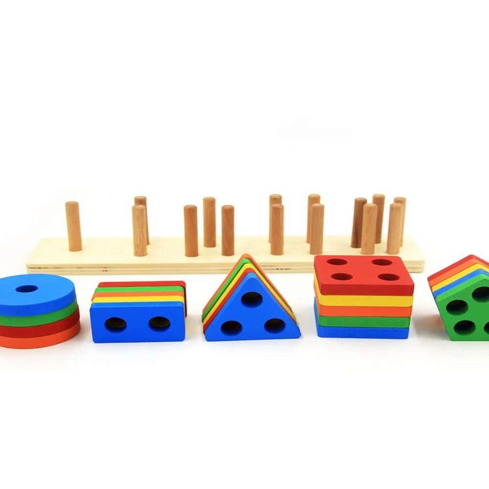 DIVERSIÓN Y ENTRETENIMIENTO Bloques apilables geométricos de madera en diferentes formas y colores brillantes. Clasifique, combine y apile en postes de madera con el color correspondiente. 5 formas y 5 colores.